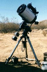 setup .......... films pictor tips Here's my Meade SSC-10 f6.3 scope (10 inch OTA on a LXD-650 mount) all set up and ready to for a night of astrophotography in the Anza Borrego desert. I bought my SSC-10 in 1993 right when they were first introduced. It's a shame the SSC line didn't last. I think the german equatorial with all of the LX200 computerized features is the way to go and it's very stable. |